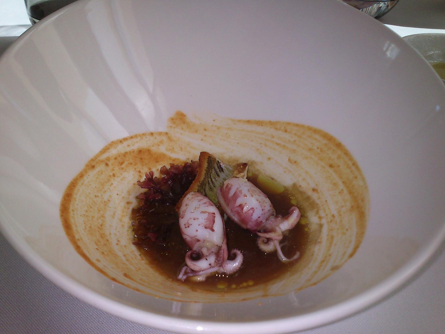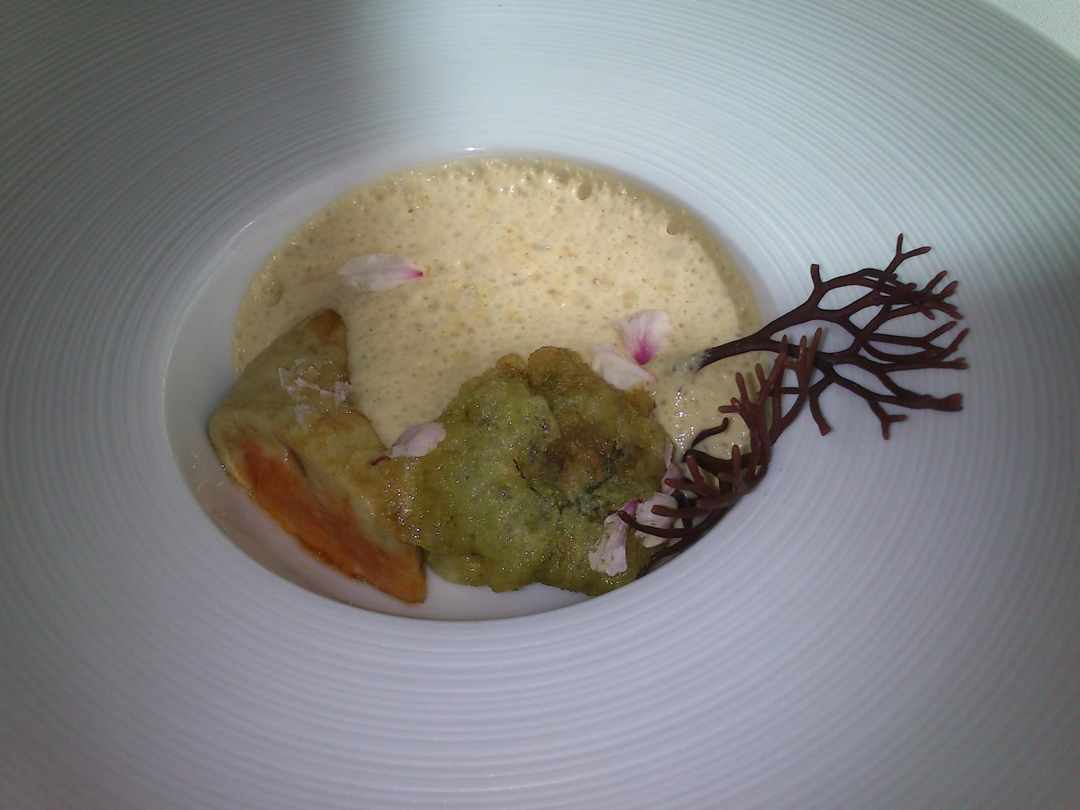 Con sabor, digamos, más Mediterráneo, cabe reseñar la espuma de suquet marinero con higado de pato y ortigas, a destacar la textura y sabor de las algas además del estratosférico suquet y, desde luego, el tartar de gambas con tocino ibérico y codium: meloso, sabroso y exquisito gracias a la ligazón que le da el tocino y el codium. Sin duda, un plato que merece matrícula de honor y es probable que el mejor, junto al suquet, el arroz y el canelón, de toda la serie.