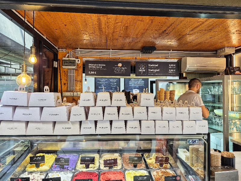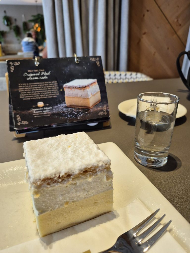 No te puedes ir de Bled sin probar el kremšnita (blejska kremma rezina) del hotel Park de Bled. Lo puedes tomar allí mismo o llevártelo en una cajita.