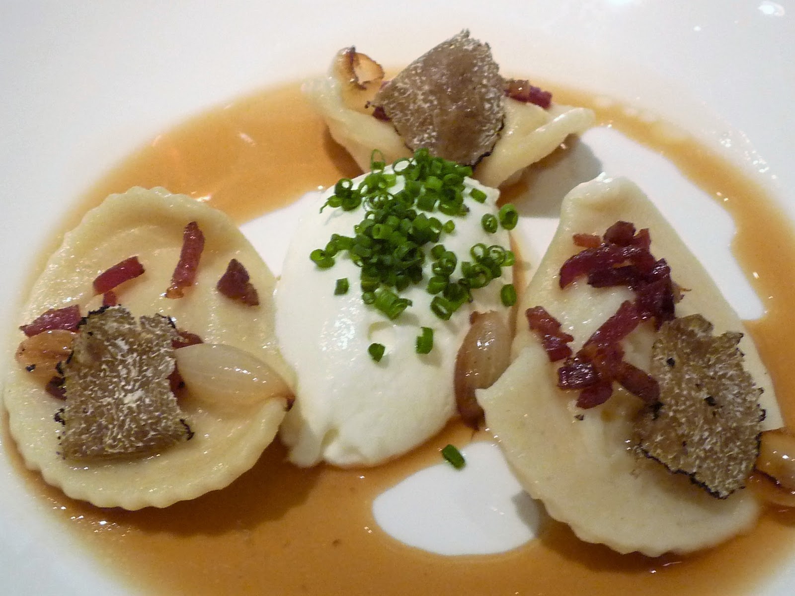 Los de B.W. aparte de añadir trufa y bacon ahumado, van bañadas en un consomé de cebolla de un sabor estratosférico.