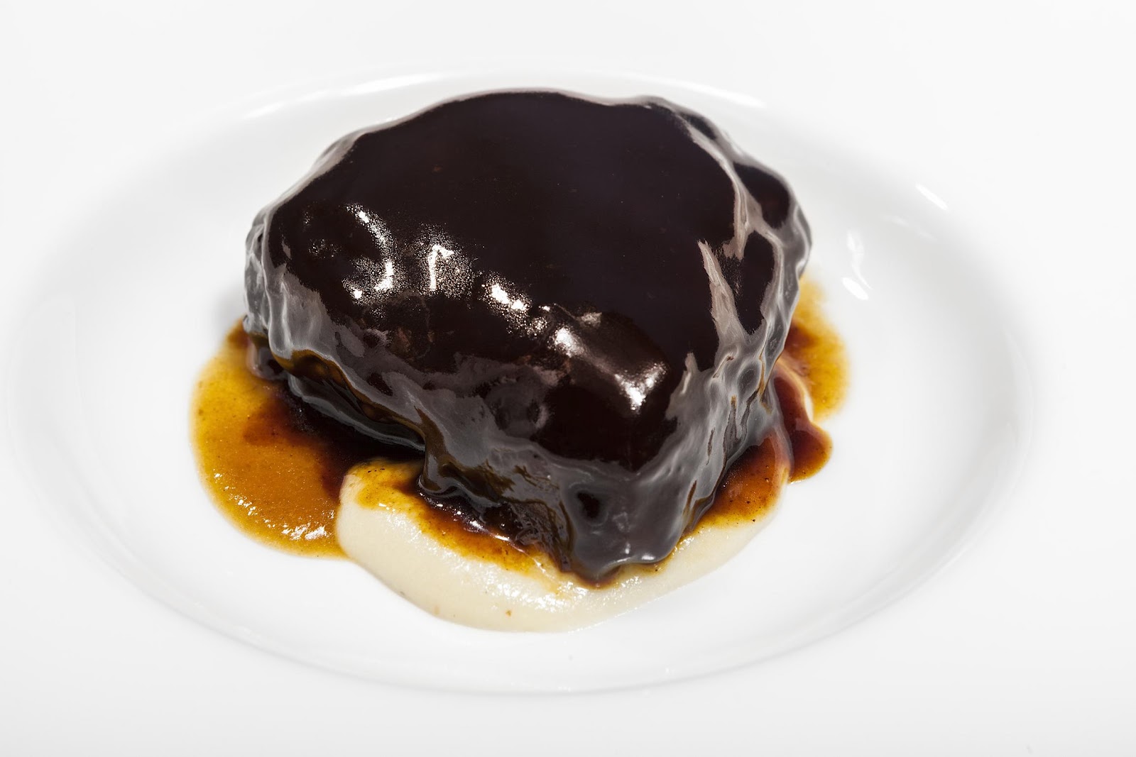 En cuanto los pescados, yo probé la hamburguesa de bonito con mostaza verde y ketchup. Este plato es buena muestra del restiling al que someten, Quirós y cia, sus elaboraciones. Compacta por fuera, cruda por dentro, espectacular, equilibrada, sabrosa…una delicia. También puedes pedir merluza de delante a atrás, como dicen ellos, cogote, tajada…etcetera, o las carnes, desde guisos como la capípota (guiso meloso de morro y pata con huevo frito) a la carrillera de novilla estofada con hojaldre relleno de puré de queso azul de Tresviso. Yo tomé carrillada de ternera con puré de patatas cruzadas y la verdad es que se deshace en la boca. Delicada y en su punto justo, es una apuesta segura incluso para quien no le guste mucho la carne. El toque de la patata, en dos texturas, sublime. Bravo por la carrillera.