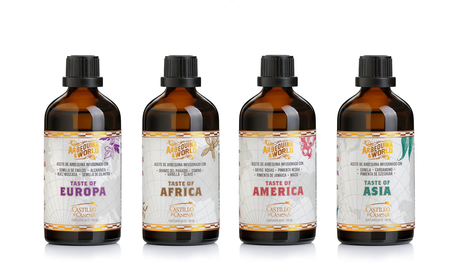 En este mundo arbequina o Arbequina World, se han elaborado cuatro aceites mediante un sistema de producción artesanal que individualiza el sabor de las especias y el aceite para que se integren en armonía. En ellas se han utilizado especias como la canela, el cardamomo, la pimienta de Szechuan, las bayas rosas o el comino, entre otros.
