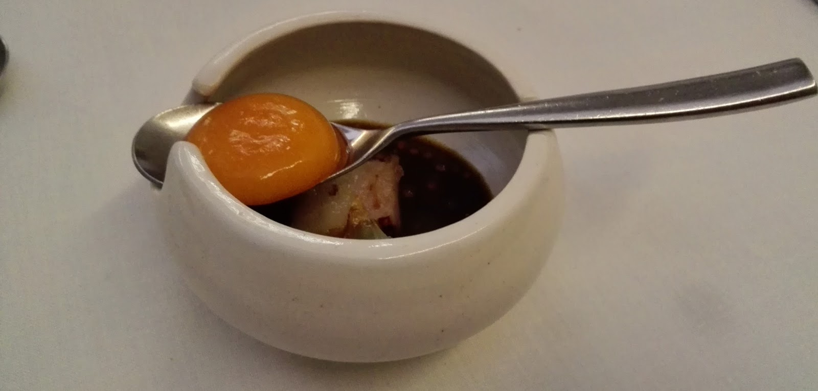 Una yema de huevo ‘fosilizada’ que hay que revolver con la cebolla y el caldo, y que se vuelve seda pura en un juego de sabores extenuante.