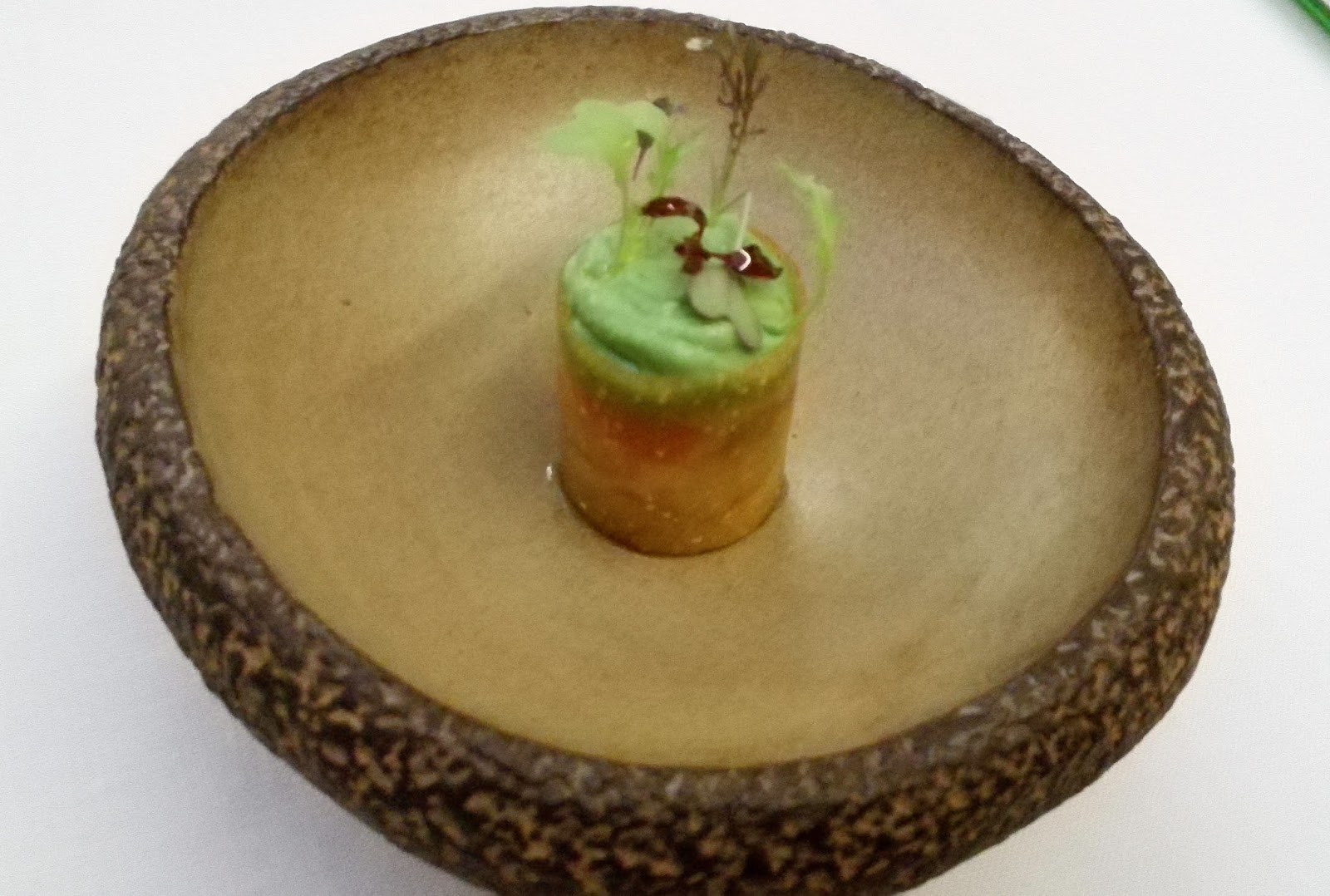 Un langostino de Sanlucar y su salmorejo de aguacate fue el plato más difícil de comer, porque aunque el formato es rompedor y la fusión descarada, el rulo caramelizado resulta demasiado grande para quienes no tenemos la boca grande. ¿Por qué no hacer el rulo un poco más pequeño? Es una idea.