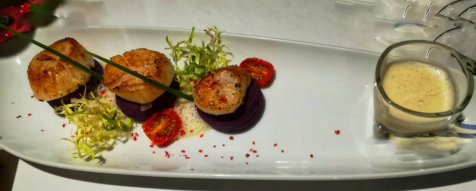 Otro de los platos que tuvimos el placer de degustar fueron los scallop, o sea, vieiras, en una especie de ajoblanco realmente meritorias.