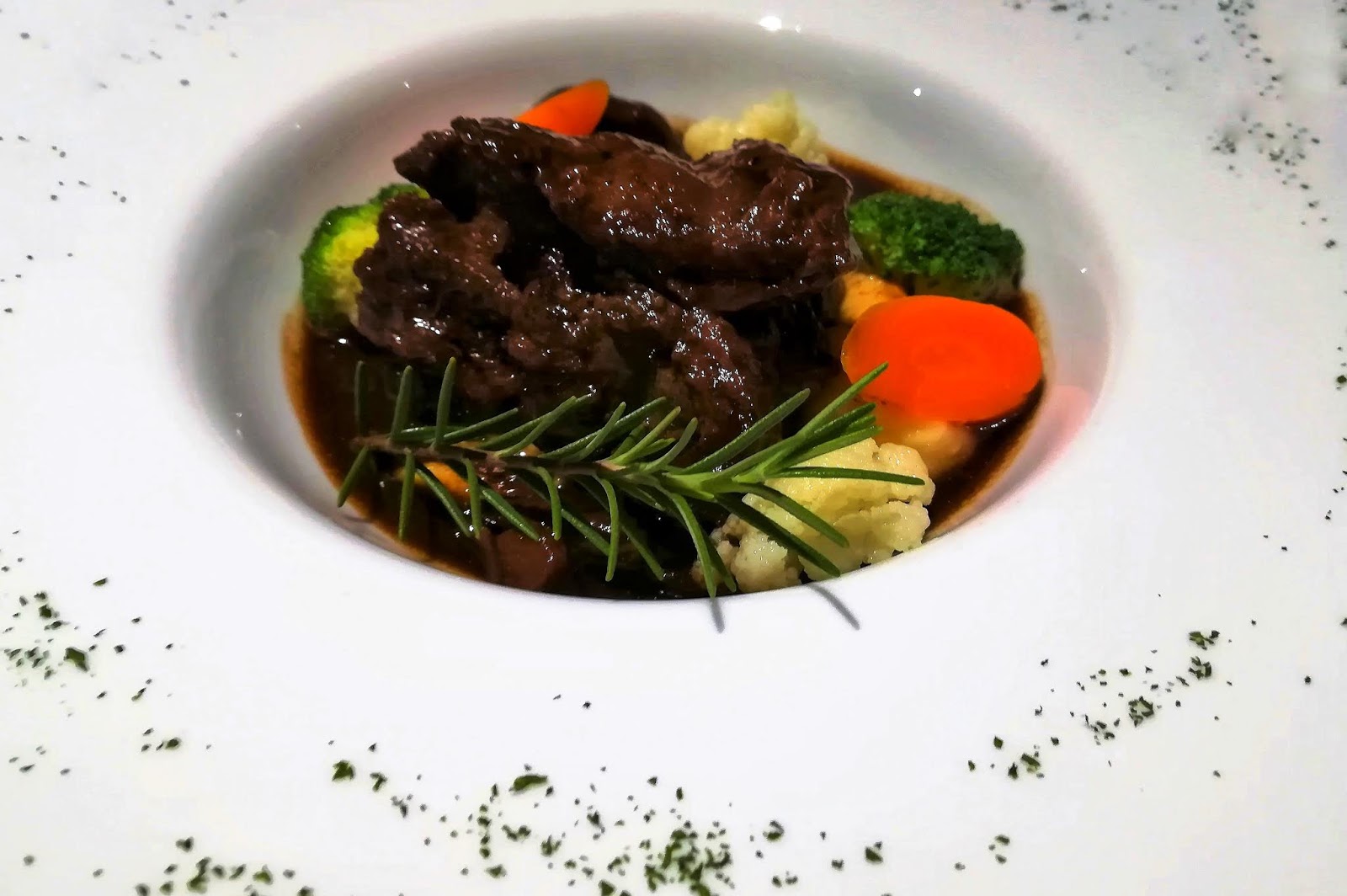 Y desde luego su filete Bourguignon hecho a fuego lento con vinto tinto y puré de patatas parisino (Braised Beef cheek slow-cooked in red wine with Paris mash).