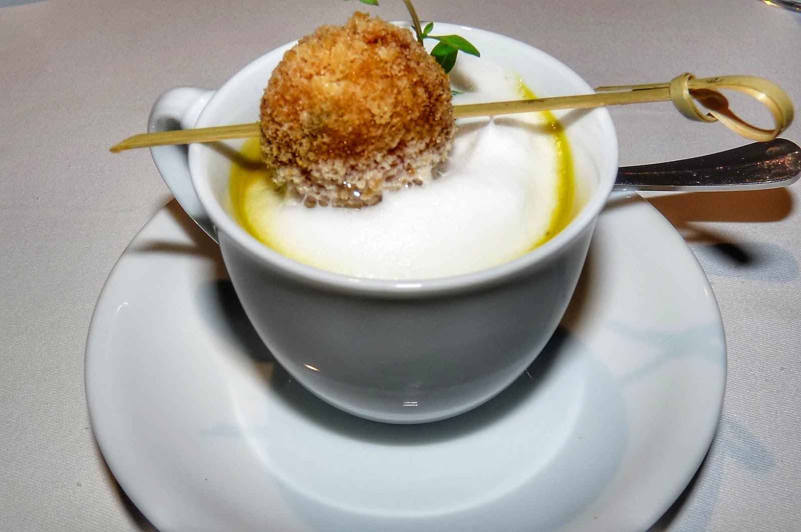 Uno de los platos de la carta del David Kitchen que está en el listado de la cocina de autor del chef O (la carta cuenta con un apartado especial) es la Velouté de calabaza con croqueta y huevo.