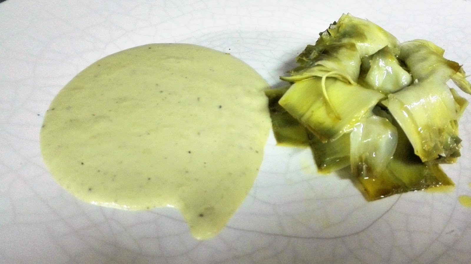 La realidad de los platos que llegan a la mesa, retuercen con tozudez esa impresión, dado que tanto los sabores como las salsas y bases o la cantidad de las raciones son suficientes para contentar a cualquier comensal, como ocurre con la alcahofa confitada con un humus elaborado a partir del propio tallo de esta hortaliza. Aparte de aprovechar todo, el resultado es esperanzador para el paladar porque sube las expectativas.Analizado con posterioridad la salsa es espectacular, como una bearnesa vegetal y la alcachofa desprendía cierto dulzor y tenía una textura digna del mejor restaurante.