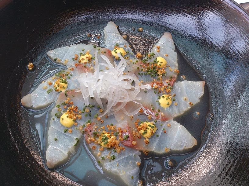 De las especialidades de su barra de sushi probamos un Gunkan de anchoa de Santoña y pico de gallo, riquísimo, un maki de langostino (correcto) y un niguiri de pez mantequilla con salsa de anticucho, que también tenía su gracia.