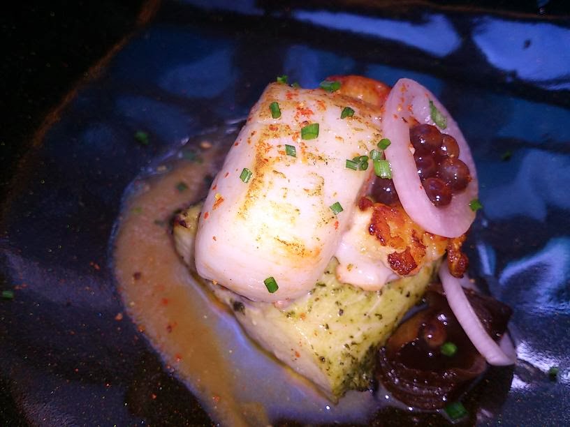 Suigiendo con esta tónica, Javier Brichetto, también elaboró una causa chifa, con puré de papa canaria con hierbas y aguacate, tataki de salmón y ají amarillo; todo en pequeños bocados y todos riquisimos, porque lo que queríamos era probar el mayor número de platos posibles (de una carta extensísima).