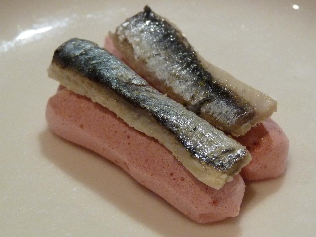 A los postres dos delicatessen bien distintas: las escamas de azúcar, yogur y chocolate blanco, finas, estilosas, con la acidez del yogur presente y los polvos de ese ‘rape’ de azúcar que casi te hace estornudar de felicidad y como final el postre de pistacho que, como en el cuento de Julio Cortázar, instrucciones para John Howel, debería entregarse con un manual.Se llama así, sin advervios soberbios, Postre de pistacho, y se come de izquierda a derecha, siempre que a la izquierda quede la esferificación caliente y a la derecha el helado. ¿Sorprendente, no?