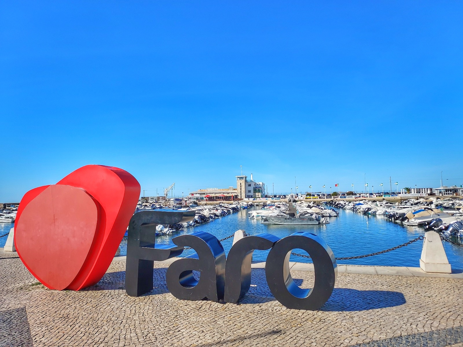 Seguramente pases por ella varias veces ya que desde aquí salen las excursiones a la Ría Formosa, pero es que aquí también está el famoso cartel con las letras de Faro y el Jardin Manuel Bivar.