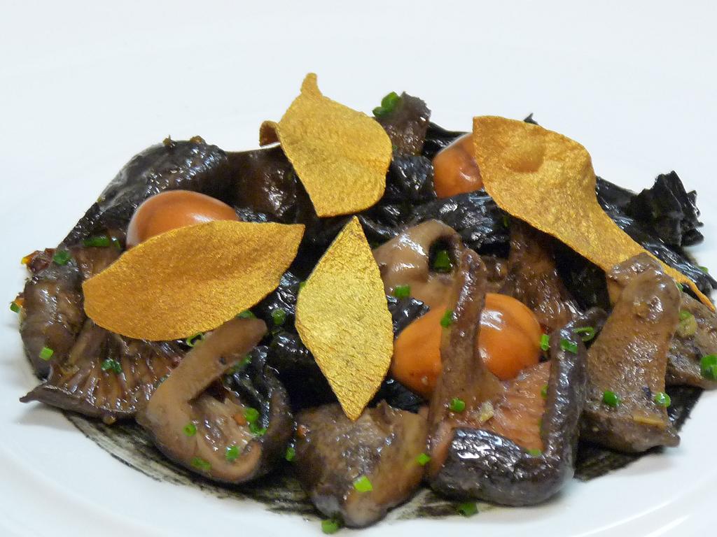 Pero si hay un plato en el que Juan Andrés Morilla roza la perfección absoluta es en lo que ha llamado paisaje otoñal que yo rebautizaría como ‘sueño de otoño’, porque es un sueño de elementos combinados que conforman un conjunto equilibrado. Como si fuera un funambulista del Circe du Soleil, el chef mantiene el pulso de una base de sésamo negro al que añade tomate seco confitado y castañas asadas bañadas en Amaretto y Pedro Ximénez. El protagonista del plato, sin embargo, son las setas –entre otras chantellesa y trompeta de los muertos (que nombre tan tétrico para un hongo tan espectacular y exquisito) y el toque final lo ponen unas hojas, como caidas de un árbol que, en realidad, son patatas doradas.