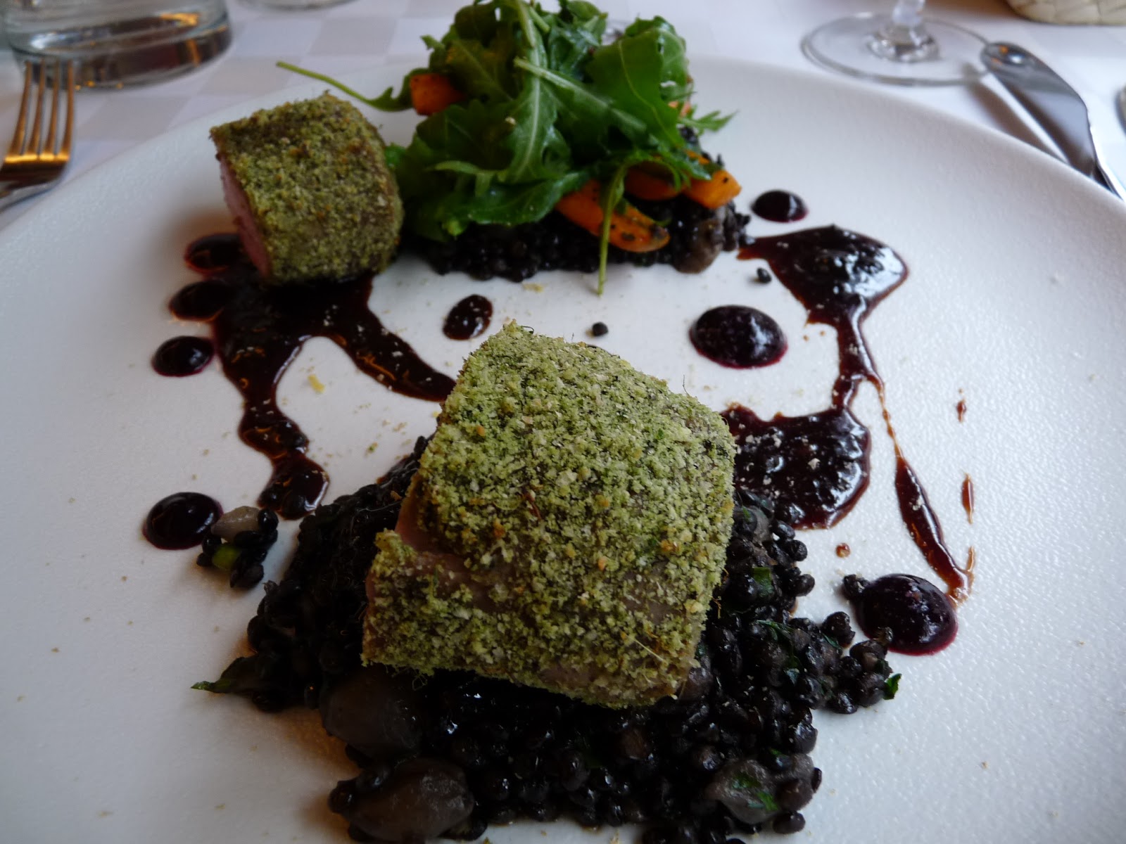 Pero es que el solomillo de ternera empanado con una tempura de hierbas, acompañado de lentejas negras, una mermelada de grosellas negras, puerro, zanahorias baby, un demi glace. aceite de trufa y queso de cabra, ganó por goleada.