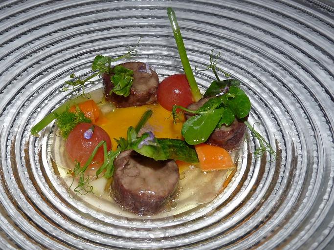 Luego llegan las habas repeladas con royal de michirones, velo de panceta ibérica,tomate seco y consomé de jabugo; son nuevas en la carta y me gustaron, estaban ricas, que es lo mejor que se puede decir de un plato sin recurrir al barroquismo.
