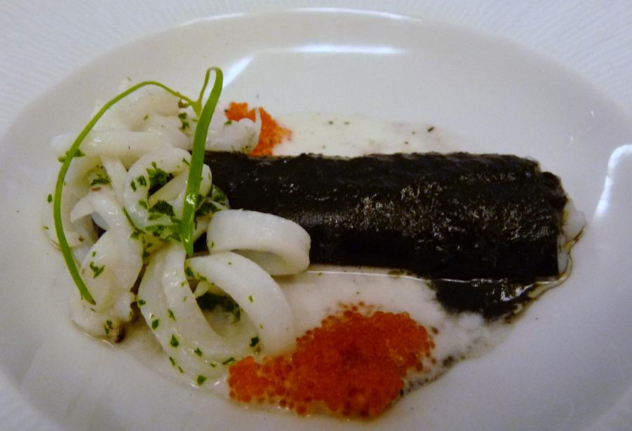 Tras ellas llega un clásico de la casa como es el canelón de calamar en su tinta con leche de almendras tiernas y huevas de tobico que desprende aromas y sabores a cada centímetro; maravilloso de punto a punto, agridulce, a veces, envuelve el paladar con un velo sensorial.