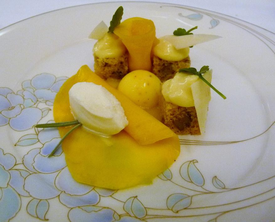 ¿Cuantas comidas acaban mal porque el postre no está a la altura? El menú sorpresa incluye dos postres: uno es un flan de tarta de queso, bizcocho de nueces, sorbete de lavanda y virutas de mango que huele y sabe a romero, servido en un plato retro de la abuela, de lo mas gracioso.