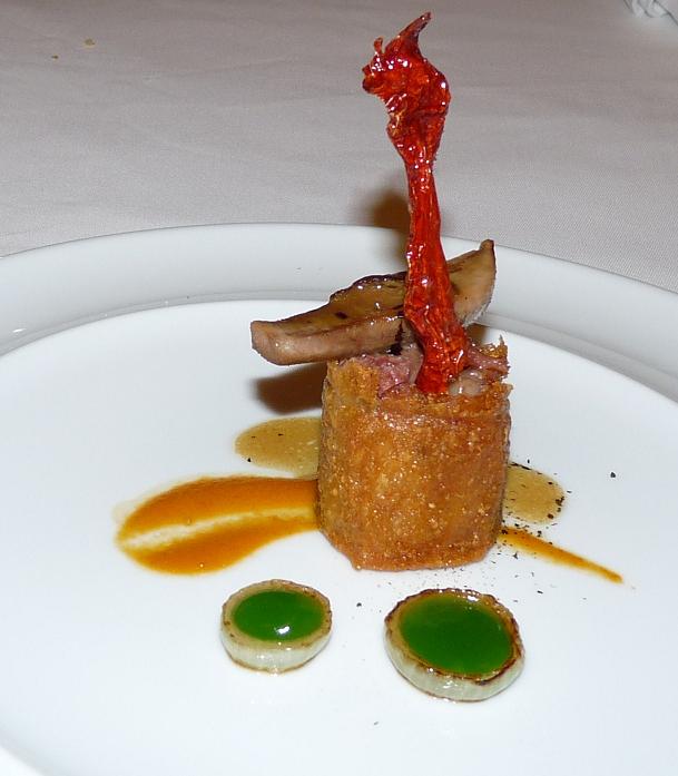 El salmonete de roca, fue el plato que menos me entusiasmó -algo debe afinar el chef en este pescado-, aunque los complementos, es decir, el carpaccio de galeras y algas marinas, eran un caprice de dieu.