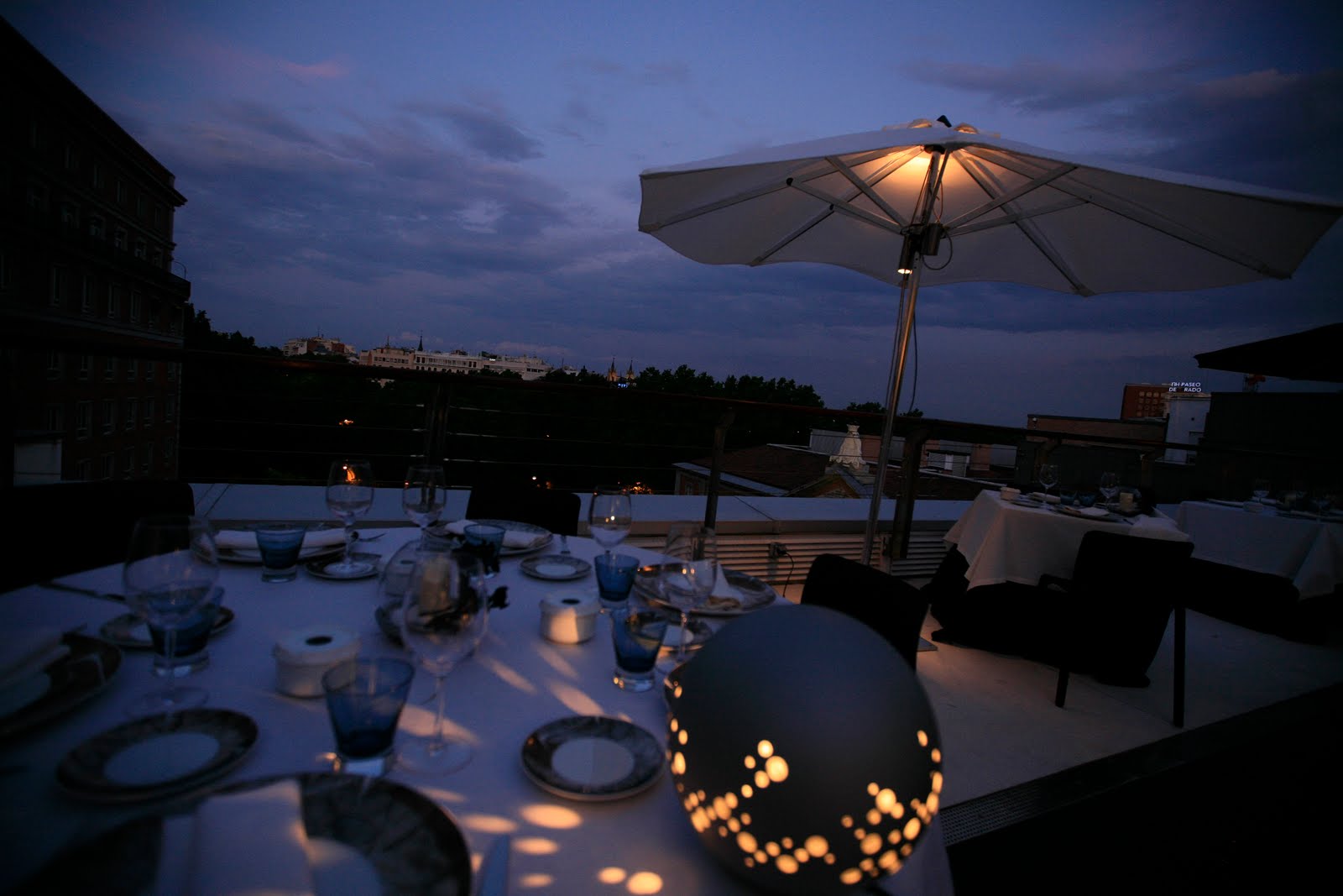Lo mejor es que entre las mesas existe la suficiente separación para provocar ese ambiente intimista que, supongo yo, quieren reflejar. Sobre ellas, velas de iluminación Led y al lado sombrillas de tela con luz individual. Así que con esos prolegómenos muy mal se tiene que dar para no disfrutar de una buena cena en compañía. Sin embargo, una sugerencia: con las noches tan frescas que estamos teniendo en Madrid, os recomiendo llevar una chaqueta o similar para mitigar lo rigores de ese viento fresco que sopla.