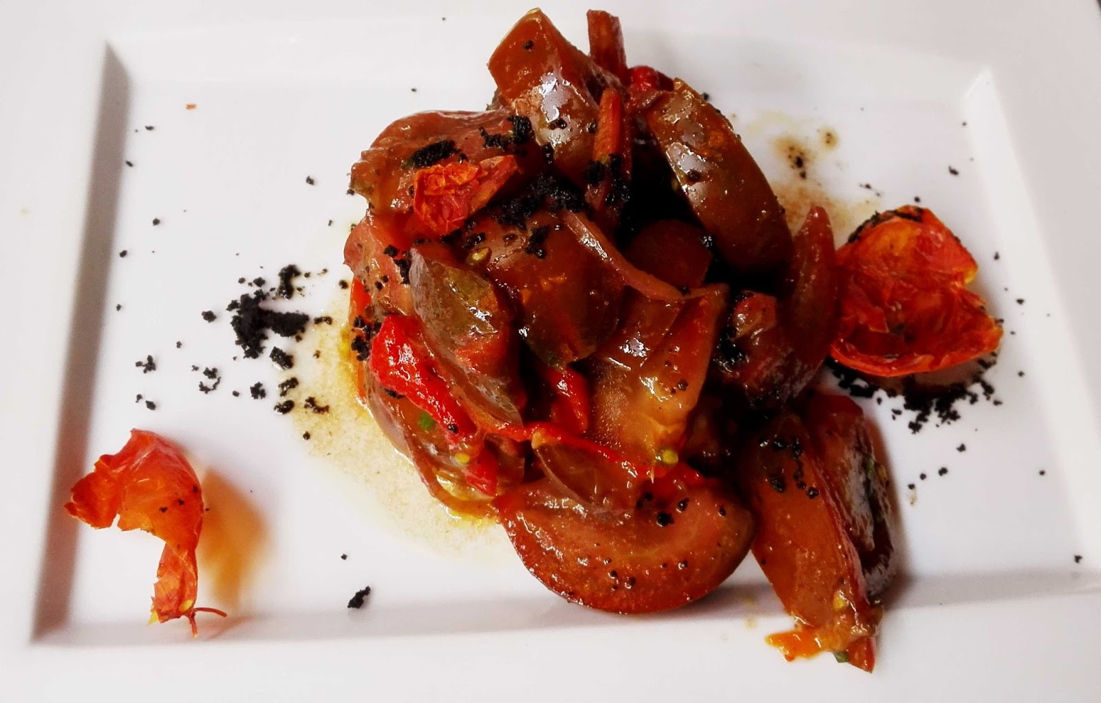 Lo que no sobra y es un entrante tan sencillo como eficaz es la ensalada de tomate de la variedad ‘otello’ que está escondido en la carta con el frio nombre de tomate, pimiento asado y tierra de aceituna negra.