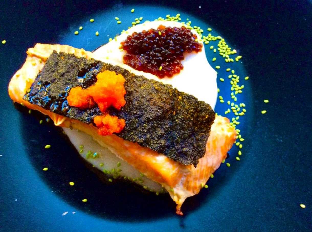 Otro de los que destacan es el salmón en crema de arroz, falso caviar de soja. alga nori frita y huevas de pez volador, que también podría calificarse como un plato de fusión con oriente y que siempre funciona bien.