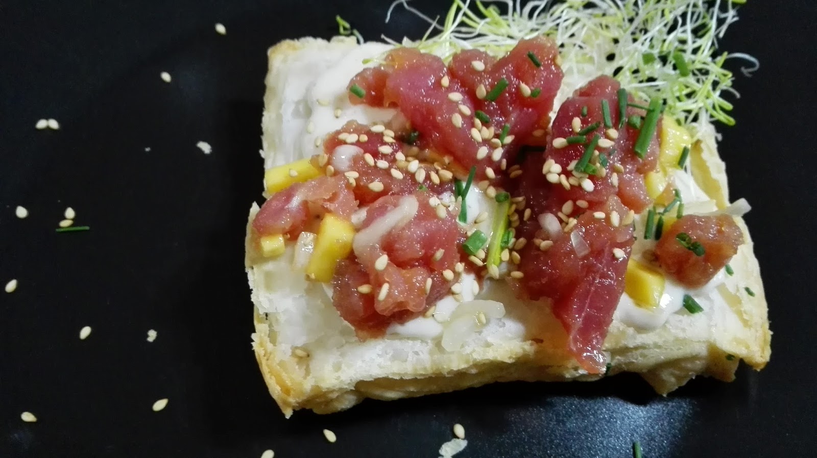 En el menú, el chef también te puede sorprender con una exquisita tosta hojaldrada de tartar de atún con mazamorra, que cuenta con el aliciente de este pan tan exclusivo preparado por un as de la panadería como es Manuel Aguilar, que tiene gran predicamento en toda la provincia de Córdoba.