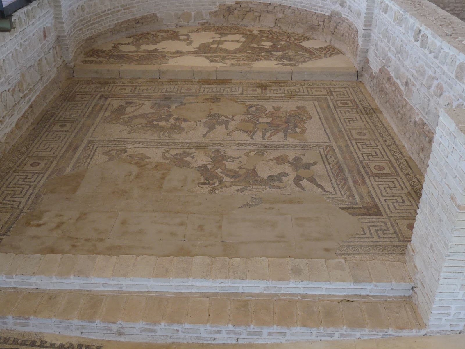 De hecho, el emplazamiento es envidiado porque algunos de los mosaicos de Fuente Alamo constituyen ejemplos únicos en todo el Imperio Romano. Se trata de los llamados mosaicos Neolíticos, considerados el primer tebeo de la antiguedad porque sus escenas (reales o imaginarias) intentaban contar historias relacionadas con la sociedad de la época y los dioses. Baco, ninfas, sátiros, el caballo alado pegaso….y las tres gracias, las hijas de Zeus, que están presentes en uno de los mosaicos mas famosos y mejor conservados.