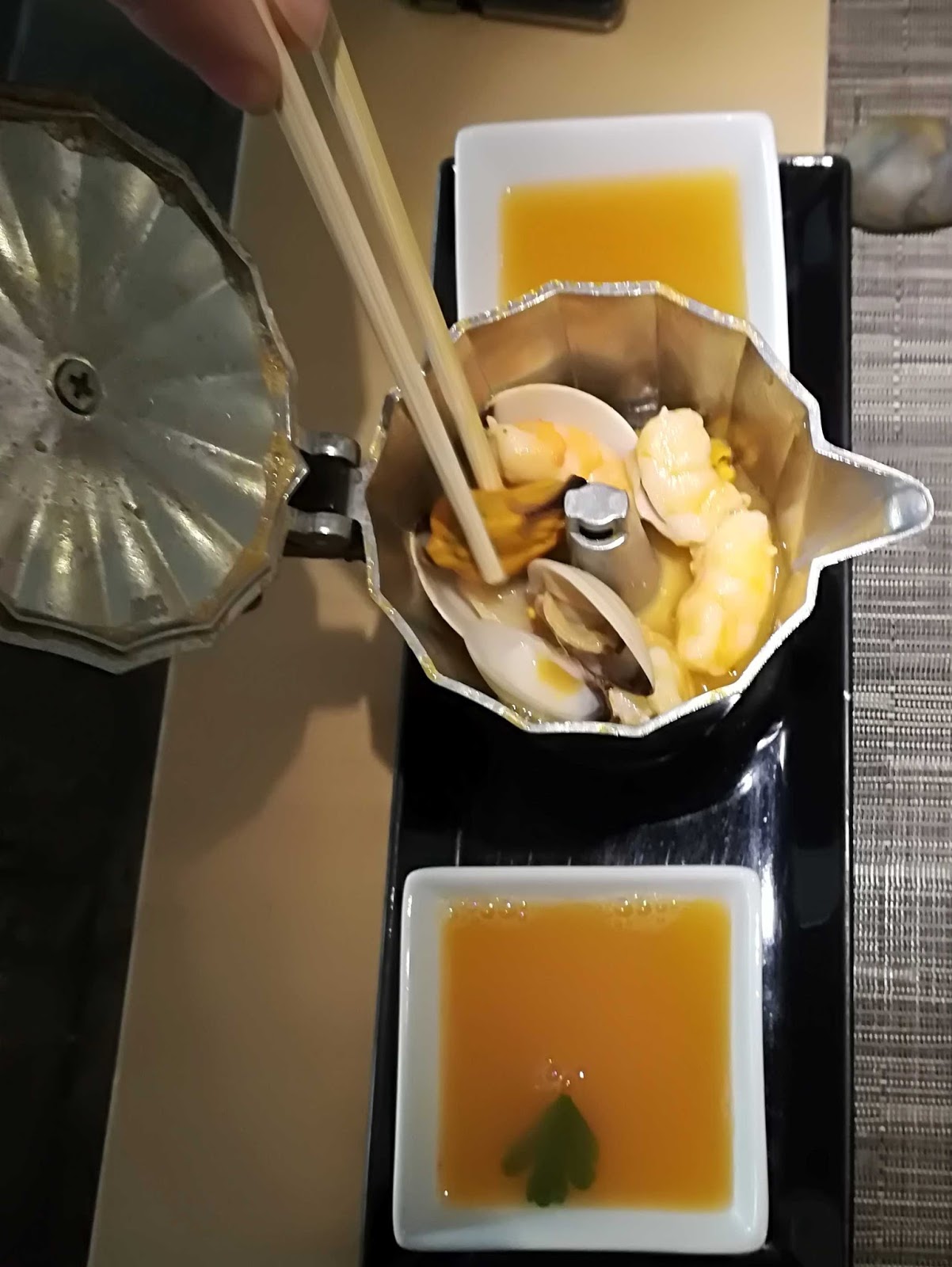 Aunque, en realidad, contiene un dashi de rica factura. Pero el entrante-postre, aloja en su interior más sorpresas como gambas, mejillones y verduras en distintos compartimentos, que sorprenden y sorprenden sin parar.