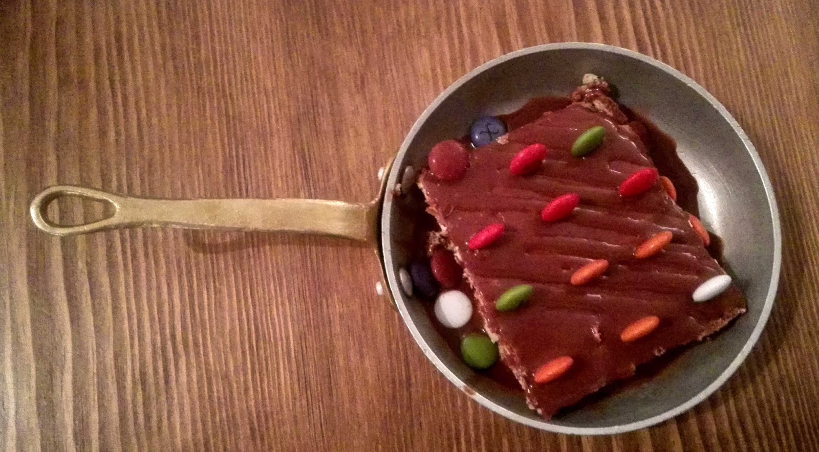 De postre una tarta de chocolate con m&m, y otra de queso, servidas en una especie de sartenes de pega, otra vez muy graciosas.