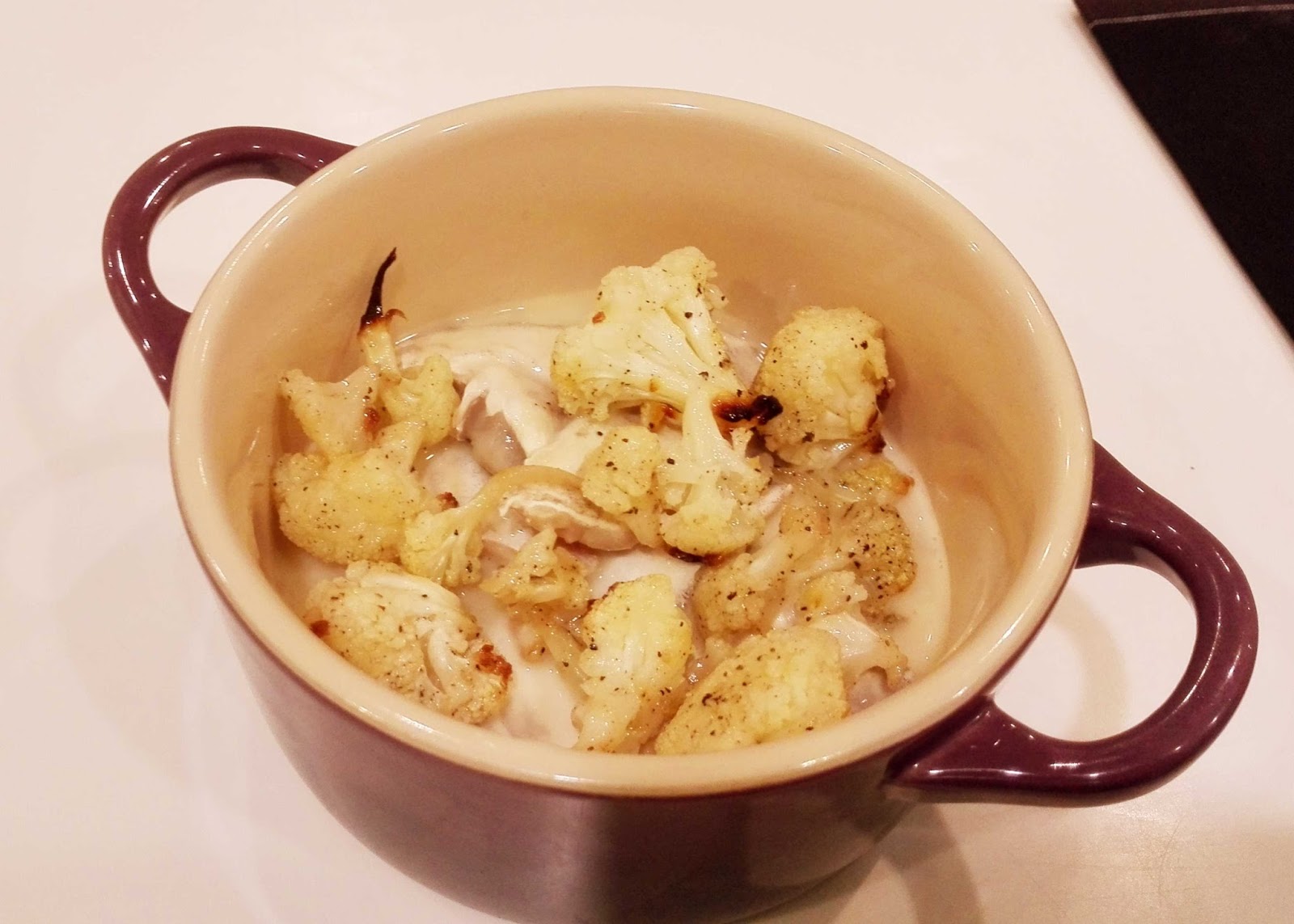 Para preparar esta especie de emulsión, similar a una mayonesa ligera, Camarena utiliza ollas (cocotte), de hierro colado esmaltado de la firma francesa Le Creuset, con la que ha llegado a un acuerdo de colaboración, que le permiten cocciones rapidas a muy altas temperaturas con los jugos del propio pescado y el aceite, e impidiendo la evaporación del caldo, (ademas de la colatura de anchoa, claro). El resultado es espectacular, lleno de sabor e intensidad. Al caldo lo llaman romana porque tiene un sabor parecido a la merluza a la romana aunque, en nuestro paladar, tal vez por mera acción psicológica, se impregnó el sabor de fondo a anchoa. Esta base, como confesó Camarena, la utlizan para otros platos del restaurante.