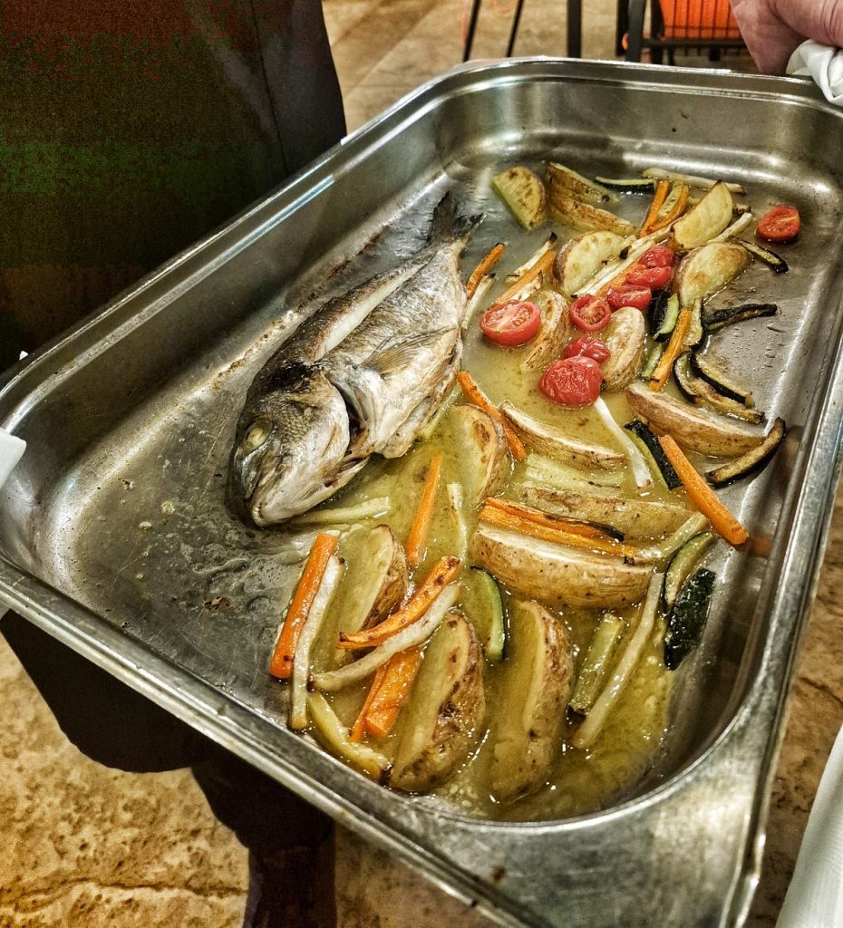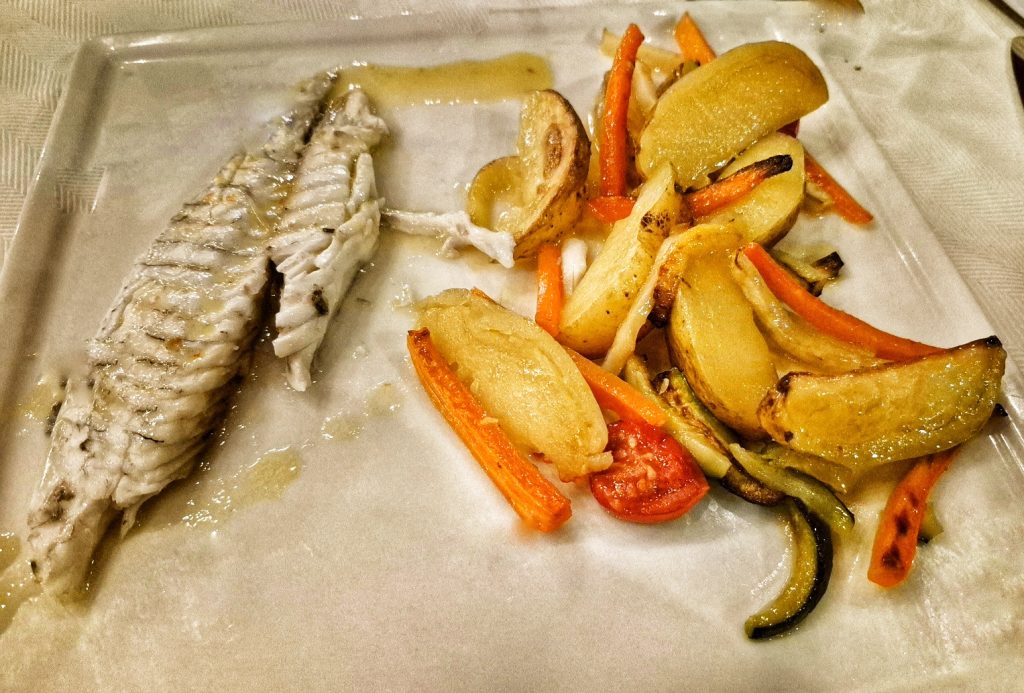 También disfrutamos con una dorada al horno con patatas, tomate, zanahoria y calabacín.