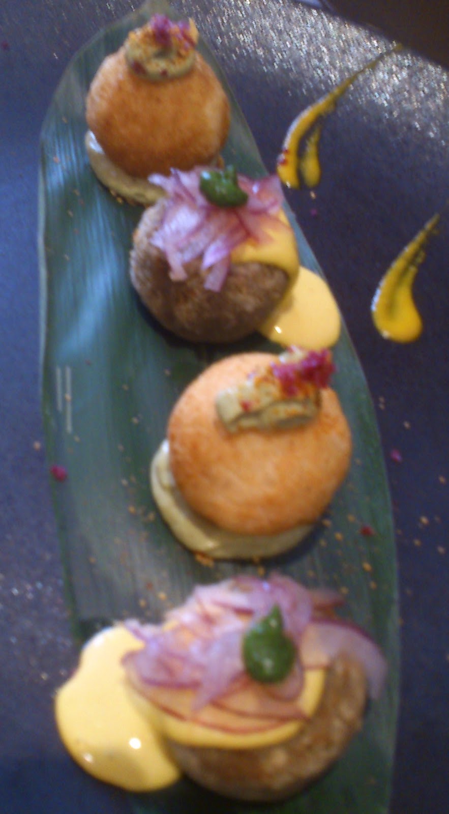 Valdivieso borda sus bombitas de arroz con pato a la norteña y una crema huancaina, que homenajea a la mejor cocina criolla, y que completa con coulis de cilantro nuevamente y uchú amarillo y, desde luego, las maravillosa boliyucas rellenas de queso fresco serrano con crema de aguacate y arená de ají al limo.